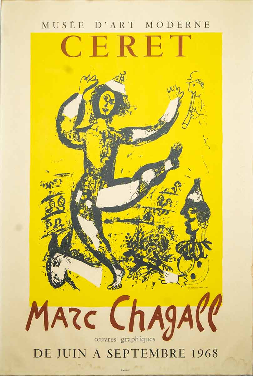 Lithographic reproduction by Charles Sorlier from a small original print, “The Circus” (1960). This poster was printed for an exhibition of Chagall lithographs at the Museum of Modern Art in Céret.