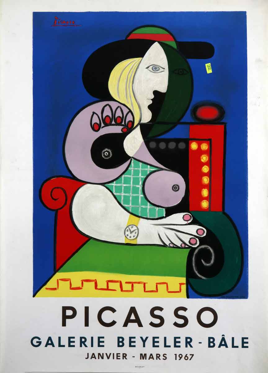 Este cartel fue diseñado por Mourlot, utilizando como tema el óleo sobre lienzo titulado “Mujer sentada con reloj de pulsera”, pintado por Picasso en 1932.