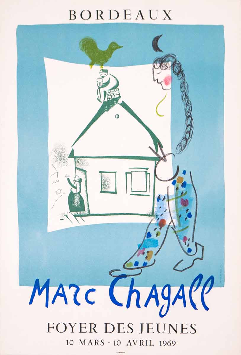 Reproducción litográfica realizada por Charles Sorlier a partir de una pequeña estampa original, “Una casa en mi pueblo” (1960). Cartel impreso para una exposición itinerante de litografías originales de Chagall.