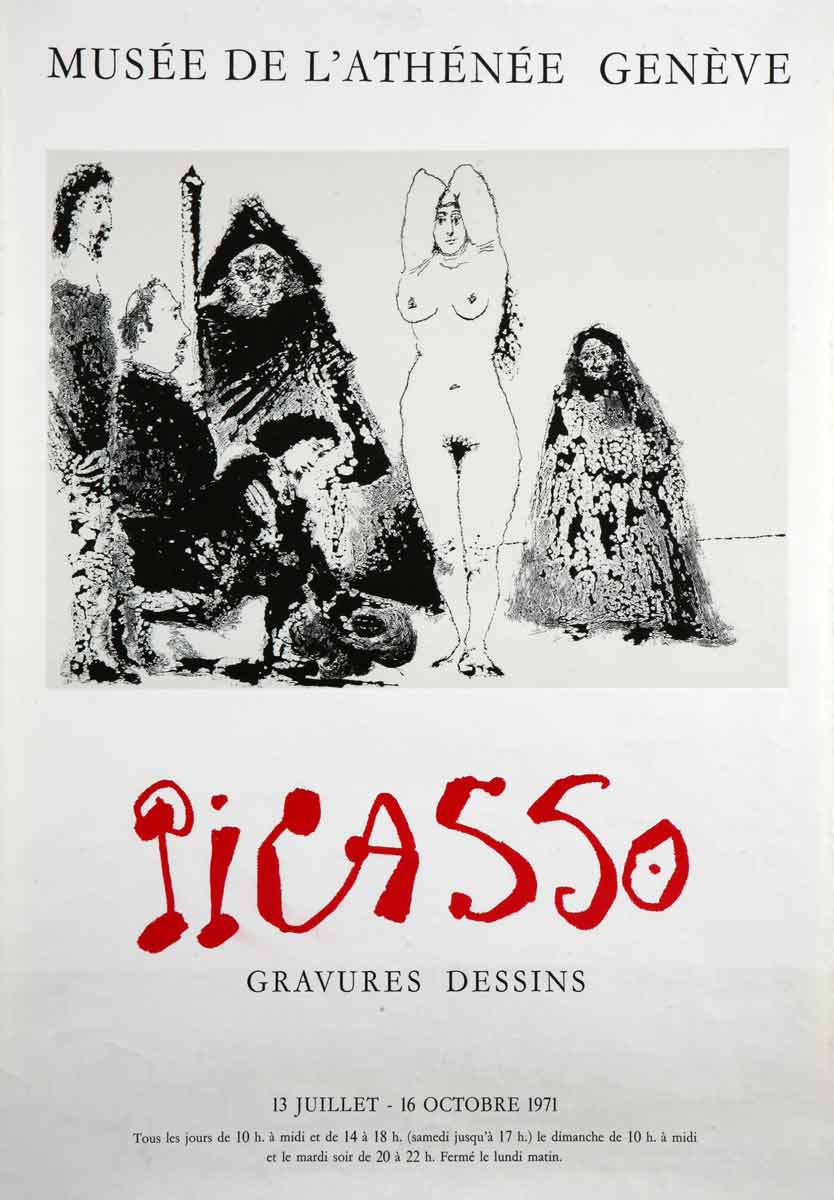 In fact, the present aquatint reveals a splendid nude Venus which the Madame submits to the consideration of her clients: three Spanish noblemen and a figure holding a large staff, a symbol of authority. Picasso’s playful spirit radiates from this work in which he combines power, nobility and money with prostitution.